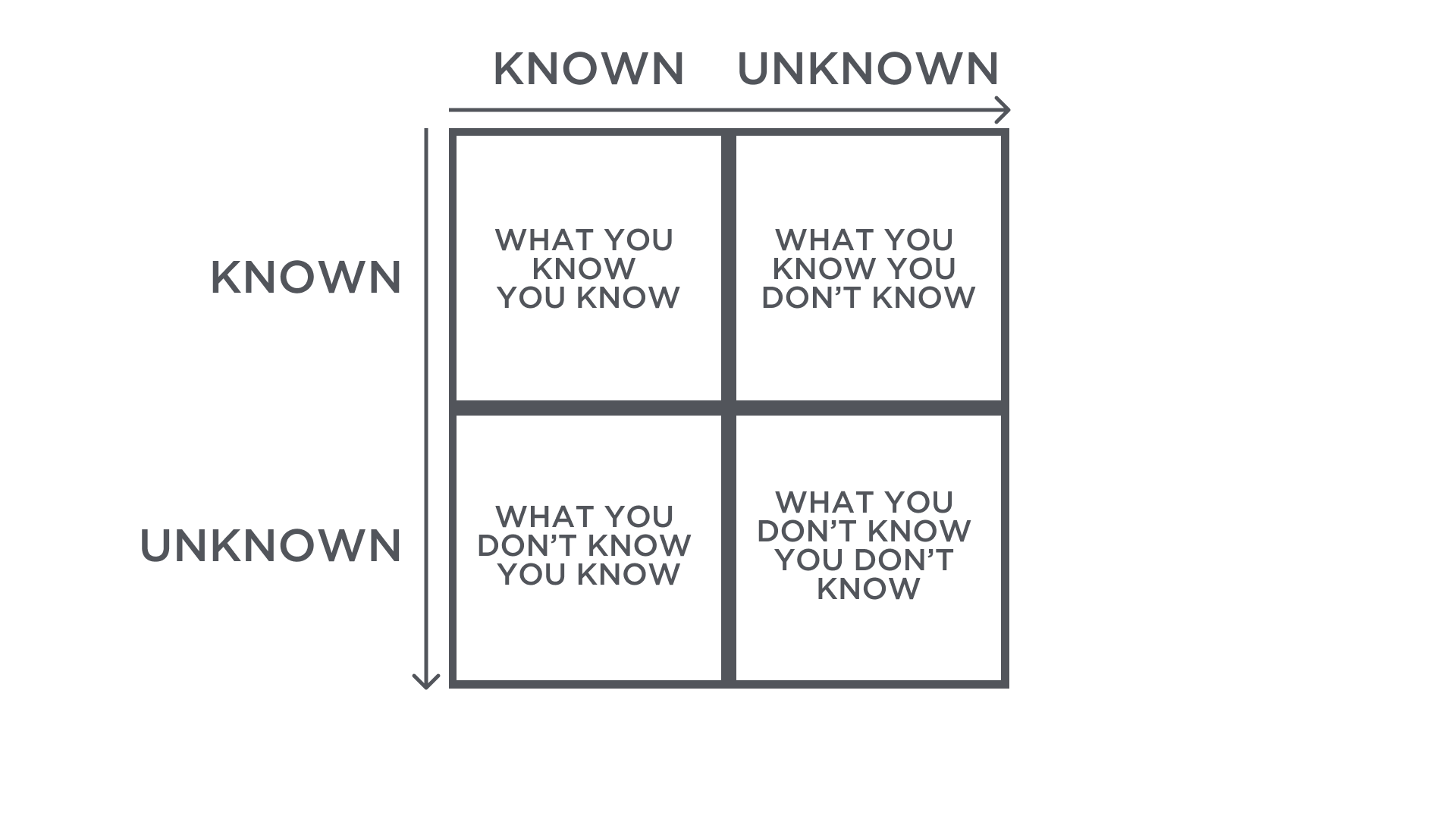 Unknown Unknowns: When you find yourself working in this quadrant, you’re completely outside of your zone of operation. This isn’t a bad thing, but there’s other people who will have the expertise to do the tasks better. It requires a significant amount of time investment to achieve extraordinary results here.