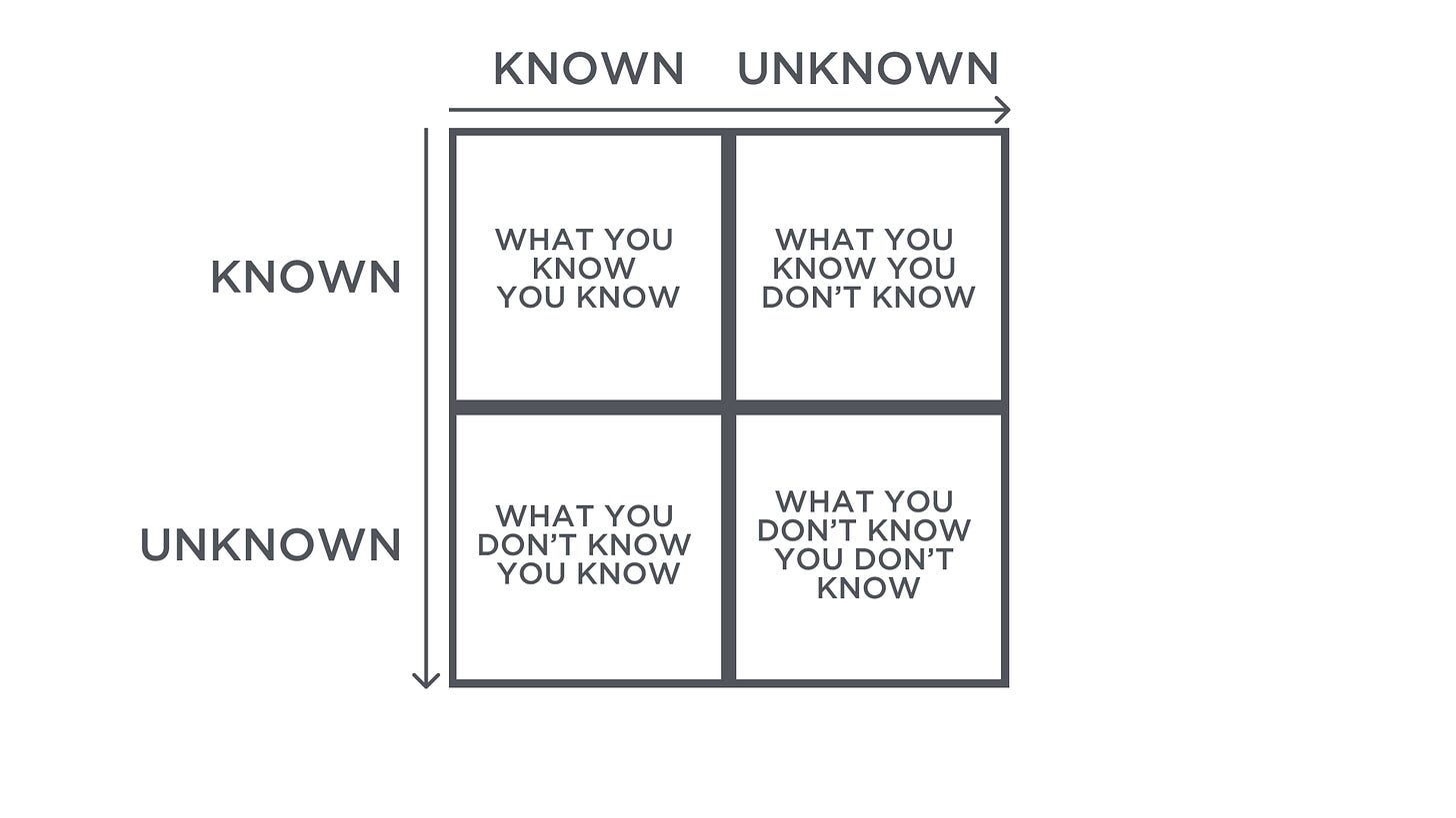 Unknown Knowns: This is all the things you’re not thinking about. It’s everything that exists just outside your zone of operations. You can learn it and grow your zone of operations from it, but it will take you longer. Relying on others to help with tasks or problems in this area will accelerate your growth.
