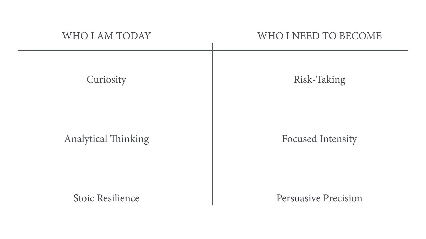 I've had to upgrade my own identity multiple times, from SDR to VC associate to product manager. I wish I would have sat down each time and conducted this simple 5-minute exercise.